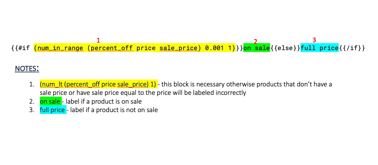 {{#if (num_in_range (percent_off price sale_price) 0.001 1)}}on sale{{else}}full price{{/if}}