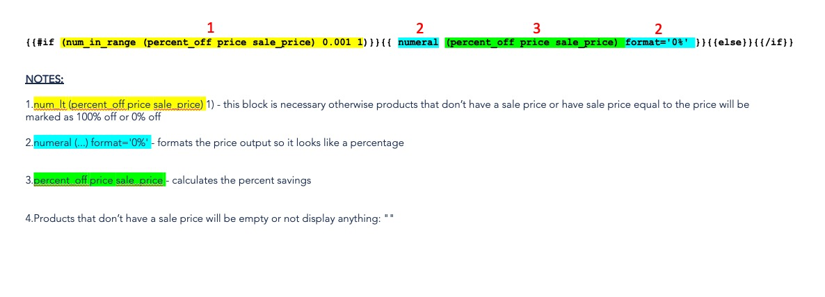 Largely used in the Creative Suite, this allows for the user to tell the system that if there is a difference in Price vs. Sale Price, a percentage off will be calculated and displayed. Or Else, if there is no difference, then display nothing.